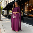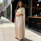 Dieses Damenkleid für die Brautmutter überzeugt durch seine ruhige Eleganz und eine weich fließende, bodenlange Silhouette. Der gerade Schnitt wird durch die locker fallenden Cape-Ärmel stilvoll ergänzt und sorgt für eine edle, moderne Optik. Ein harmonischer Look für Hochzeiten und festliche Familienfeiern.