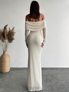 Dieses elegante Damenkleid begeistert mit einem stilvollen Off-Shoulder-Ausschnitt und einer edlen, figurbetonten Passform. Die feine Spitzenstruktur und die langen Ärmel verleihen dem Kleid eine luxuriöse Ausstrahlung, während der schlichte, fließende Schnitt für einen besonders eleganten Auftritt sorgt. Ideal für festliche Anlässe, elegante Abende oder besondere Momente.